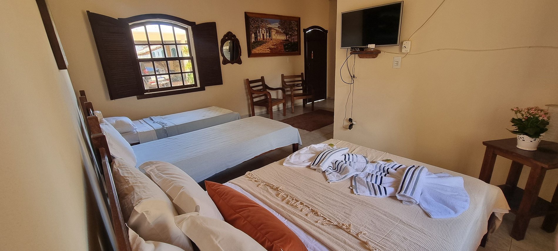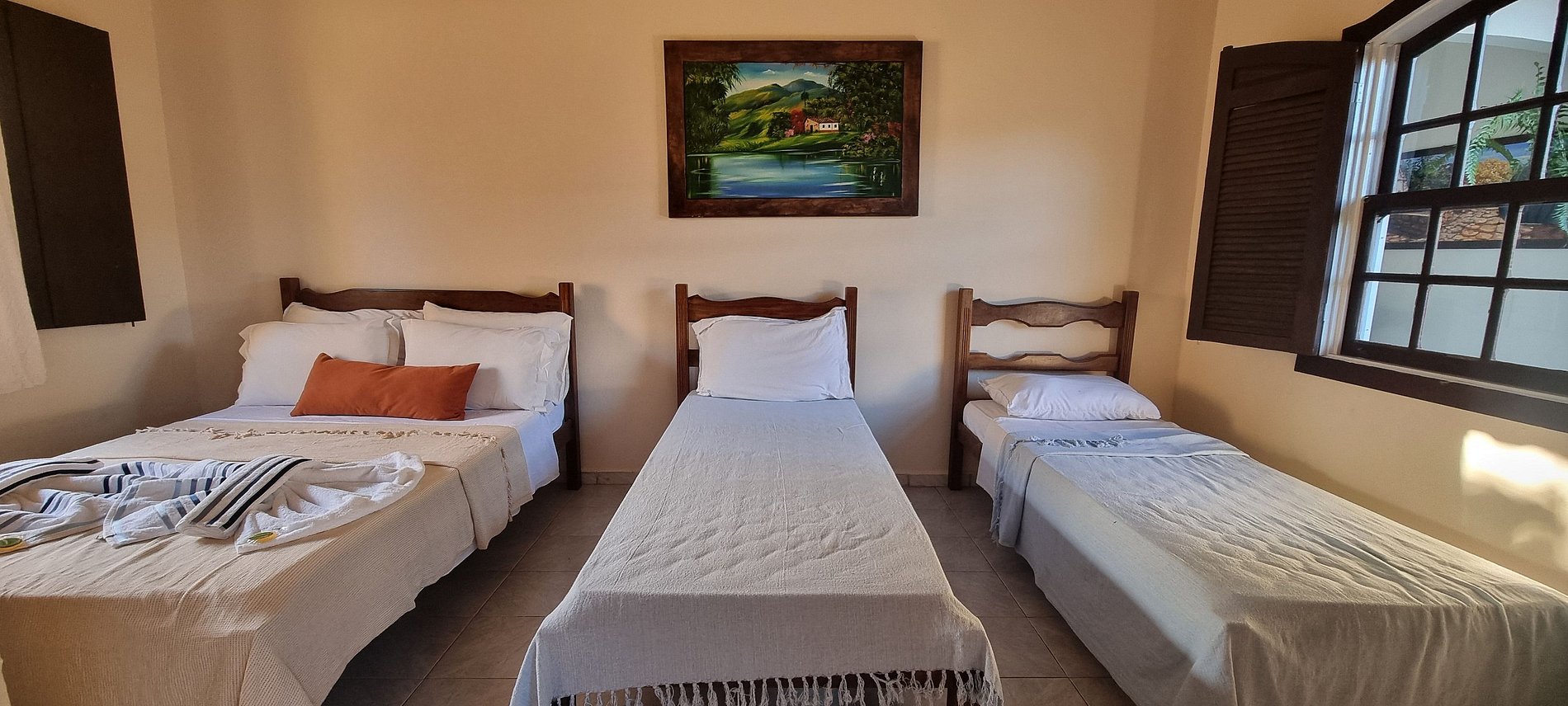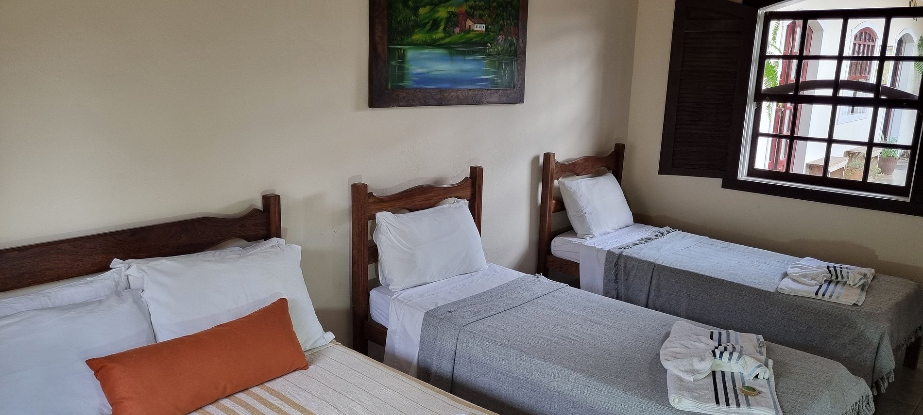 Espaçoso quarto quádruplo standard com 1 cama de casal e 2 de solteiro, ideal para grupos e famílias. Equipado com ventilador, frigobar e TV, possui uma minicozinha, sala de estar, área de serviço e banheiro privativos. Ideal para familias ou grupo de amigos que procuram uma opção mais econômica.