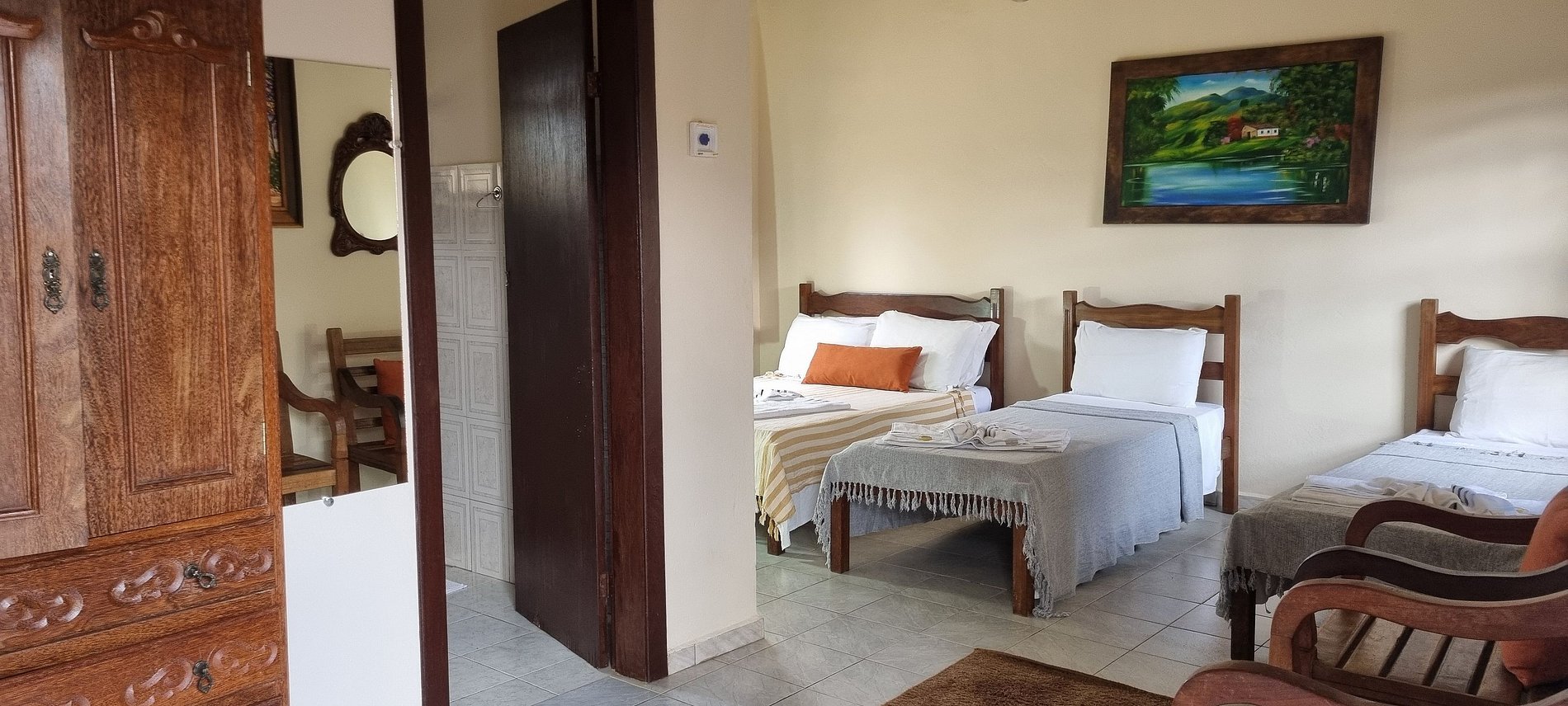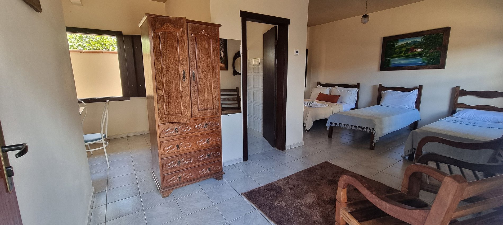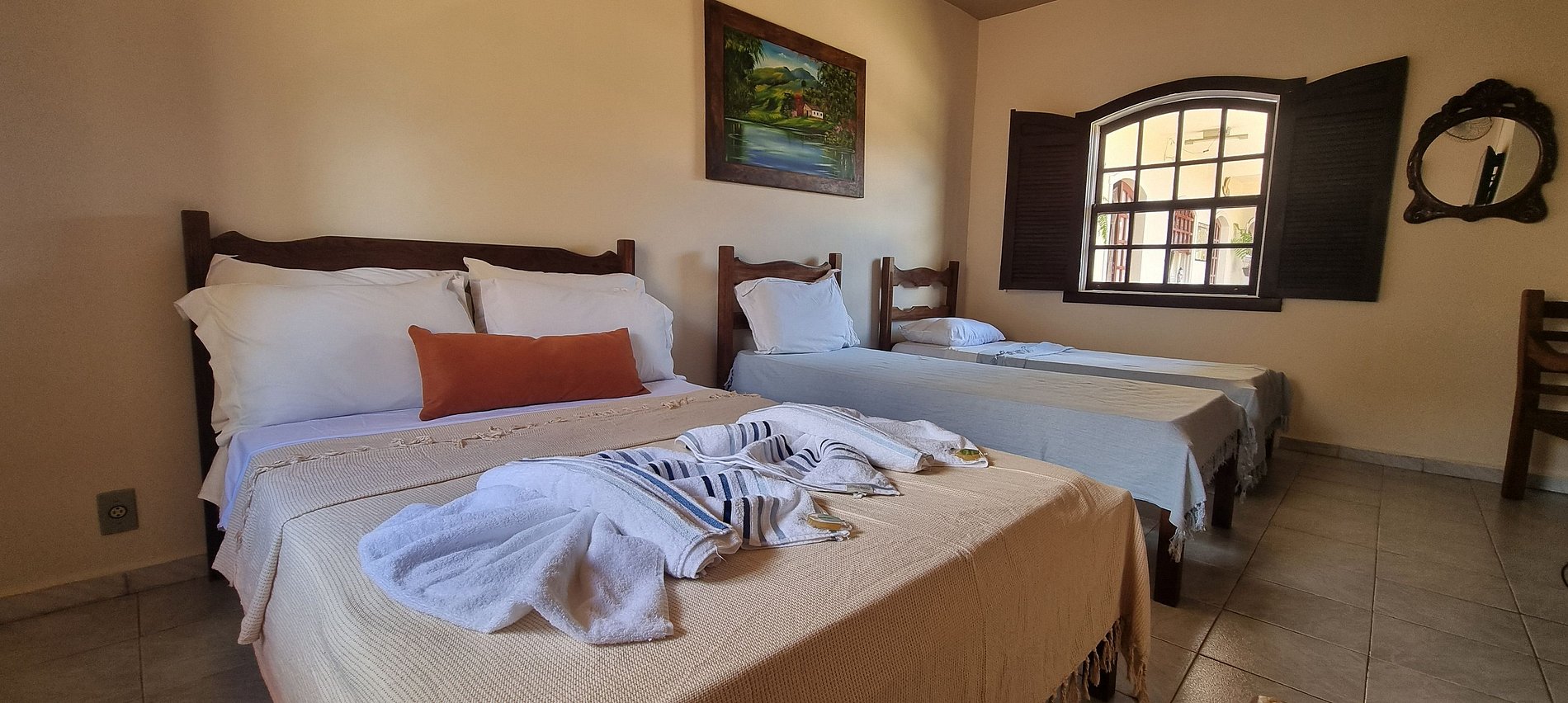 Espaçoso quarto quádruplo standard com 1 cama de casal e 2 de solteiro, ideal para grupos e famílias. Equipado com ventilador, frigobar e TV, possui uma minicozinha, sala de estar, área de serviço e banheiro privativos. Ideal para familias ou grupo de amigos que procuram uma opção mais econômica.