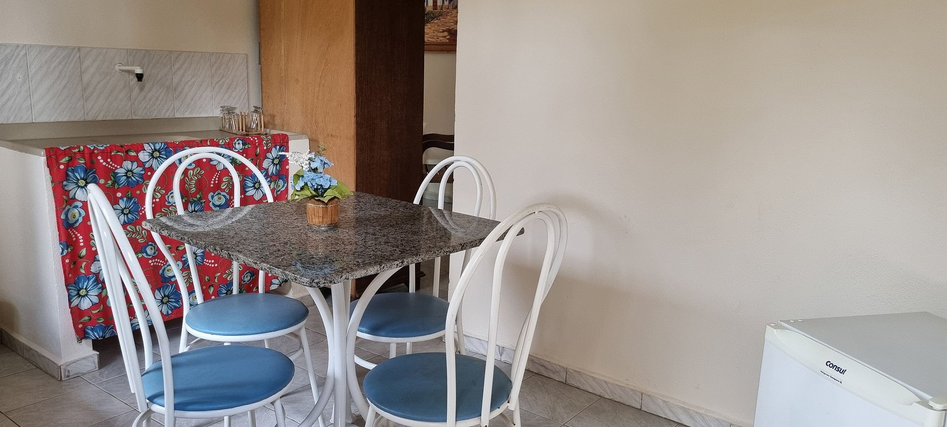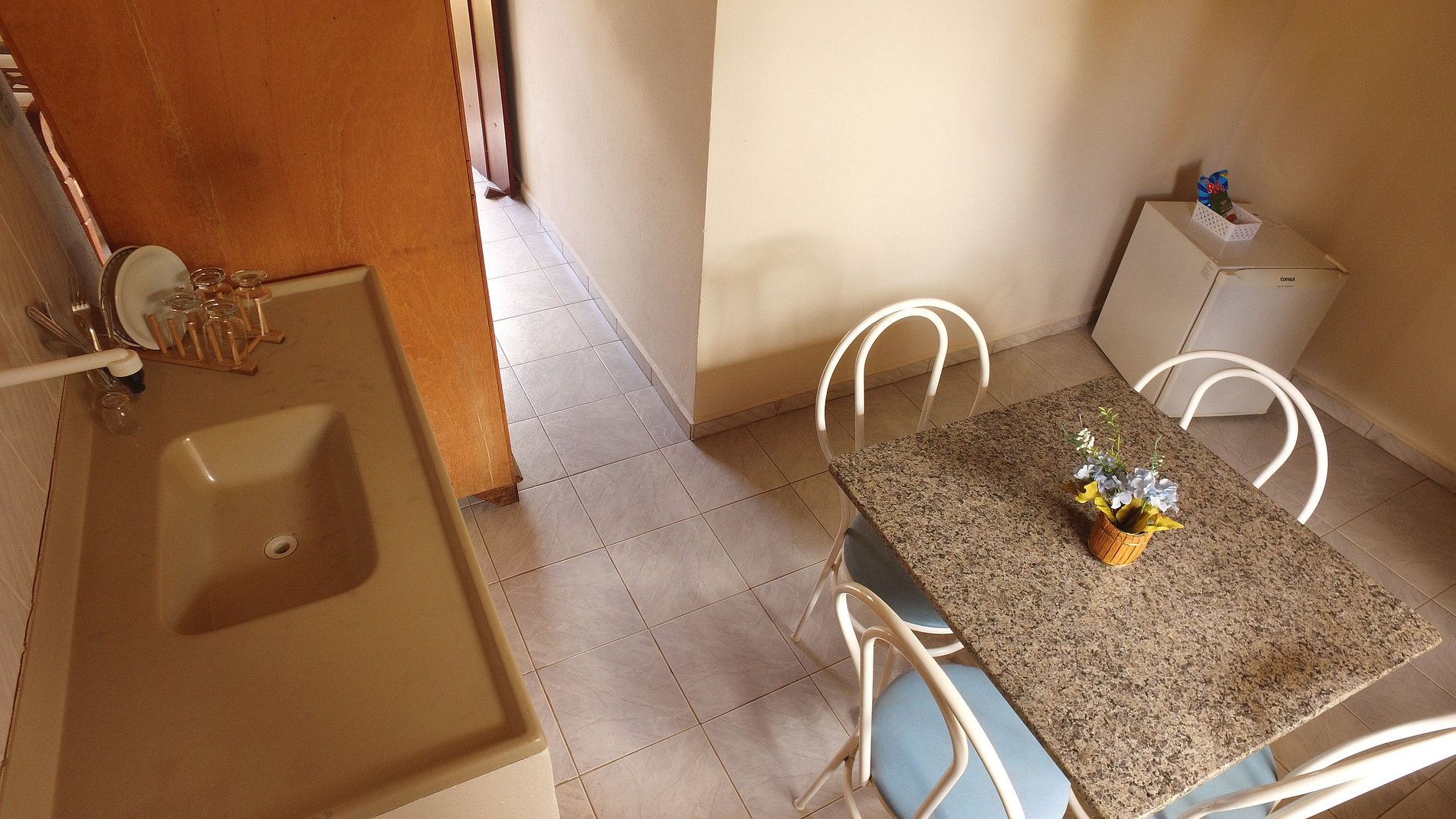 Quartos duplos, triplos ou quádruplos, equipados com minicozinha, sala e varanda/área de serviço e banheiro privativos, com frigobar, tv, wifi e ventilador.