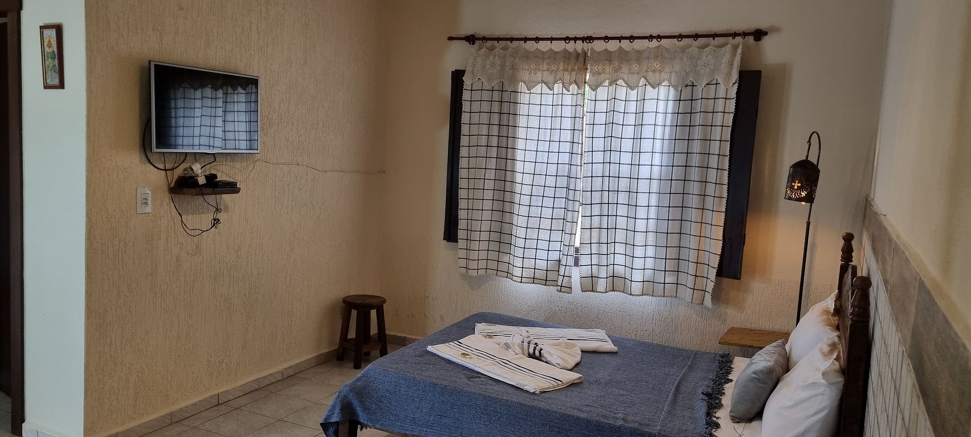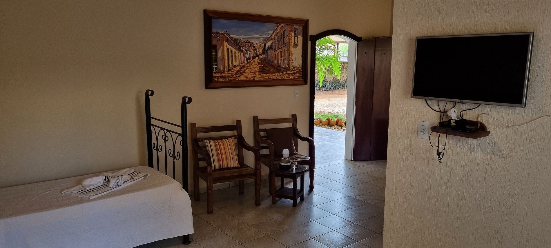 Confortável quarto com 1 cama de casal e 1 de solteiro, perfeito para casais com criança. Minicozinha, sala e varanda privativos no térreo. Com ventilador, frigobar e TV.